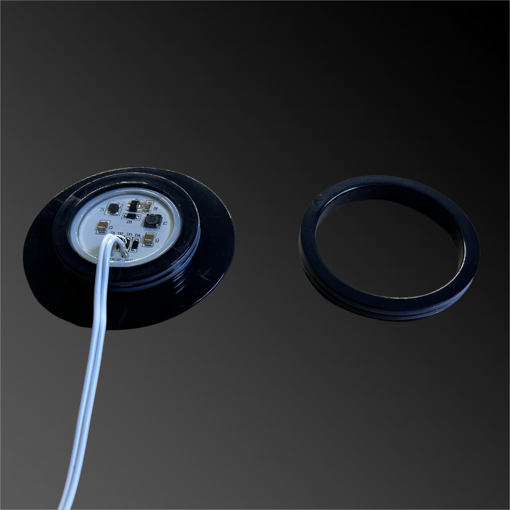 The unit is made from moulded plastic and requires a 45mm or 55mm mounting hole to install via a pressure fit. The rear of the light has a fitting ring with gaskets, if kept on the light it will fit to a 55mm hole or it can be removed to allow the light to mount into a 45mm hole.