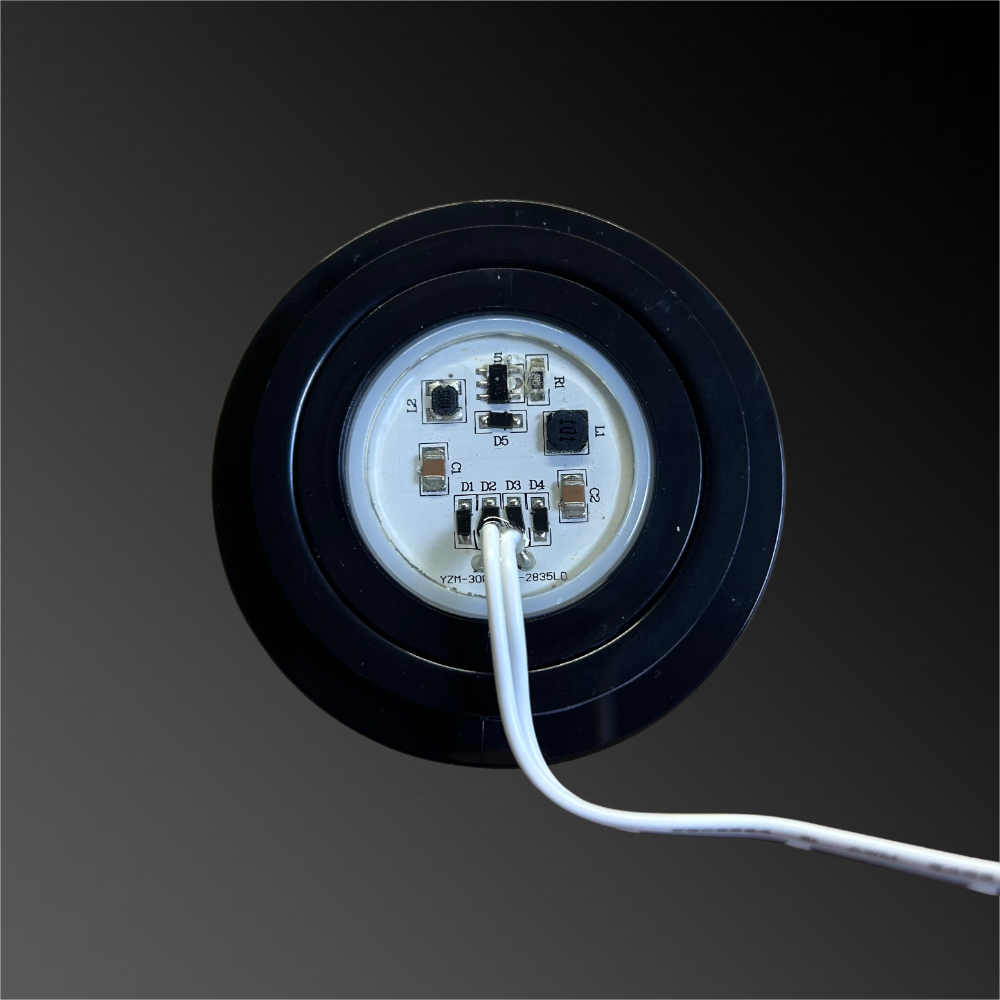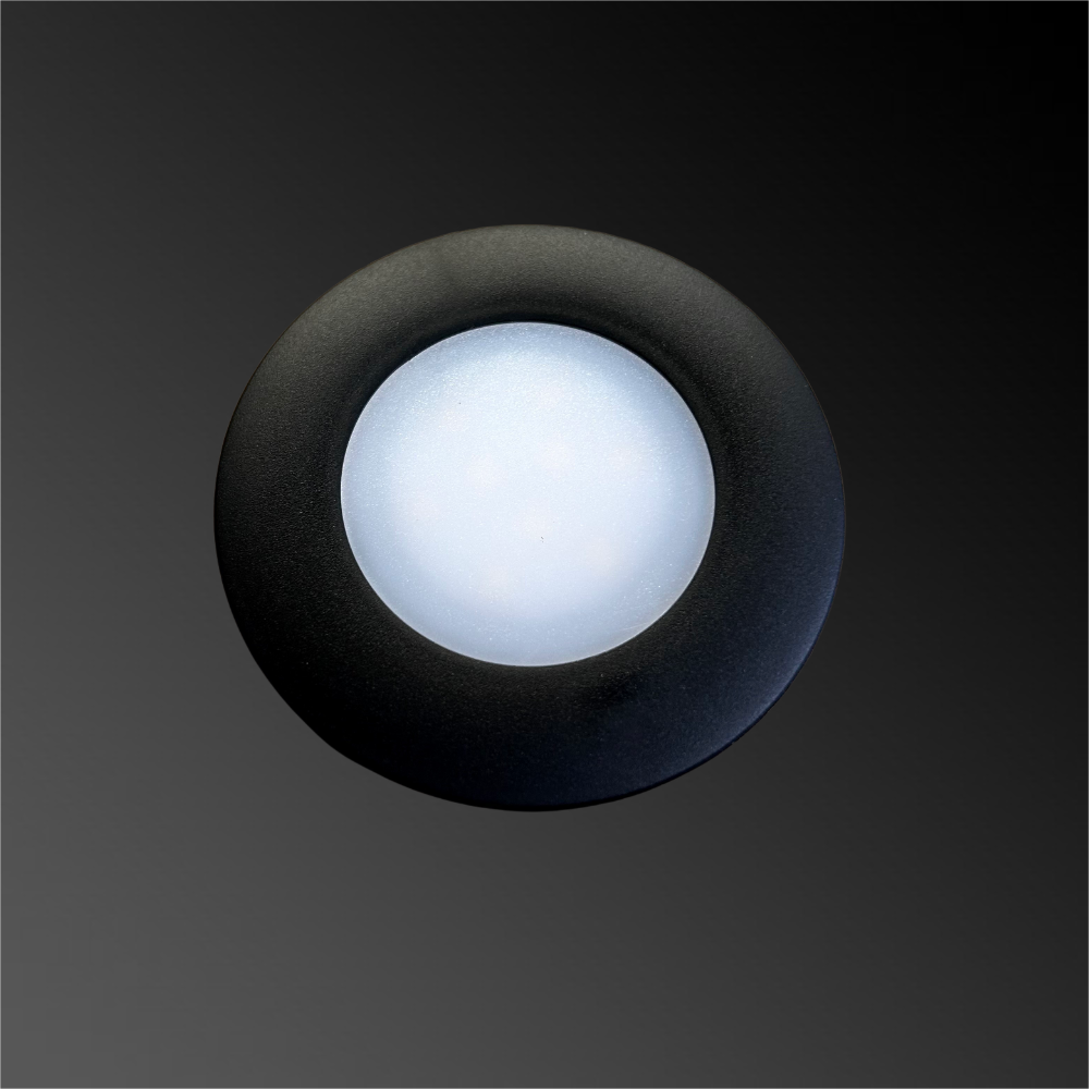 Black recess mounted downlight, designed for mounting into a hole to provide a flush fitting LED light. The light has 9 surface mounted LEDs under a frosted diffuser to provide a light output similar to a typical 10W halogen light but uses just 1.5W. This unit is waterproof and is rated as IP65.