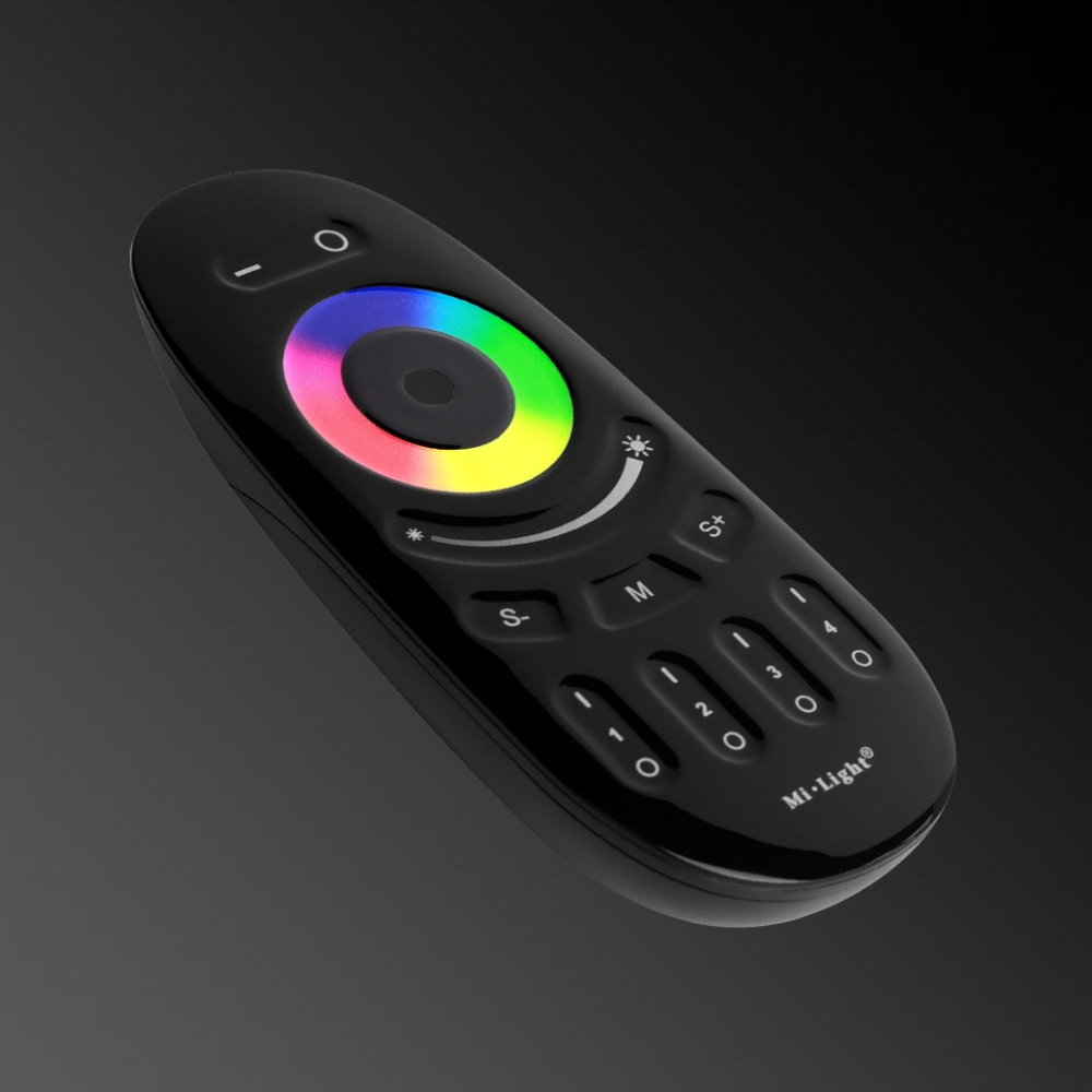 An 4-zone remote control to pair along to a suitable receiver to then operate 12V or 24V RGB (colour changing) LED. This remote enables up to 4 zones to be created by pairing suitable LED controllers to each of the zones so that each zone can be individually controlled or all zones operated at once. Suitable for use with our RGB flexible LED lighting via a suitable receiver. The remote control can be used to change colours sequentially using the touch sensitive wheel and can also dim the lighting, turn the lights on or off and also can select one of the preset programes.